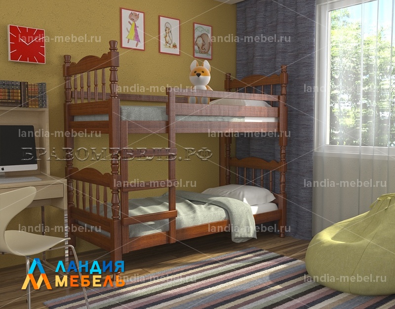 Двухъярусная кровать "Соня" изготовлена из массива сосны. Для безопасности второй ярус кровати оснащён перилами. Кровать может комплектоваться матрацем односторонней мягкости, матрацем двусторонней мягкости или матрацем из поролона. Также дополнительно кровать "Соня" может комплектоваться выкатными ящиками, что очень удобно для хранения различных вещей или игрушек.