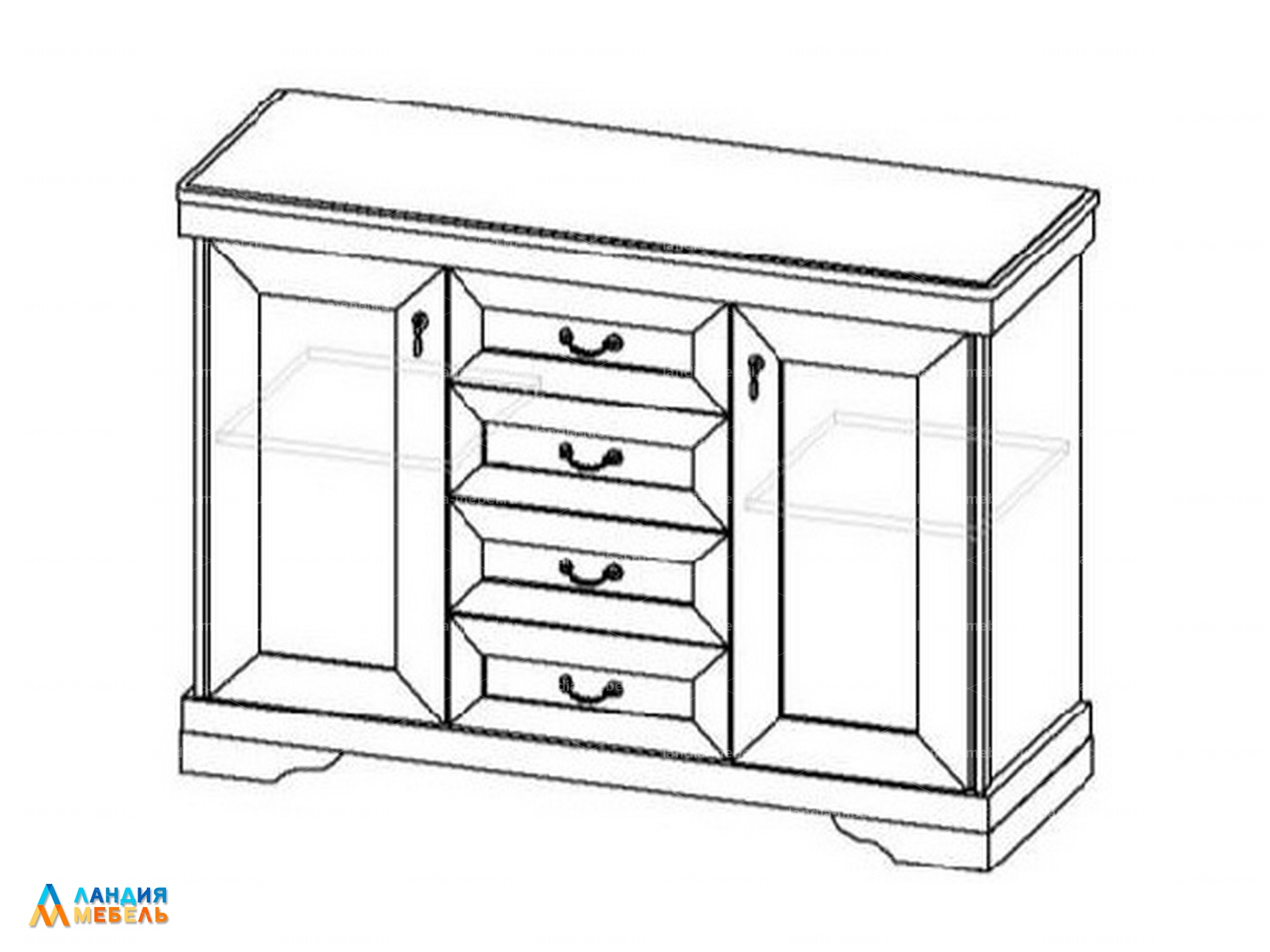 Комод оснащен четырьмя выкатными ящиками двумя закрытыми отделениями с дверцей.