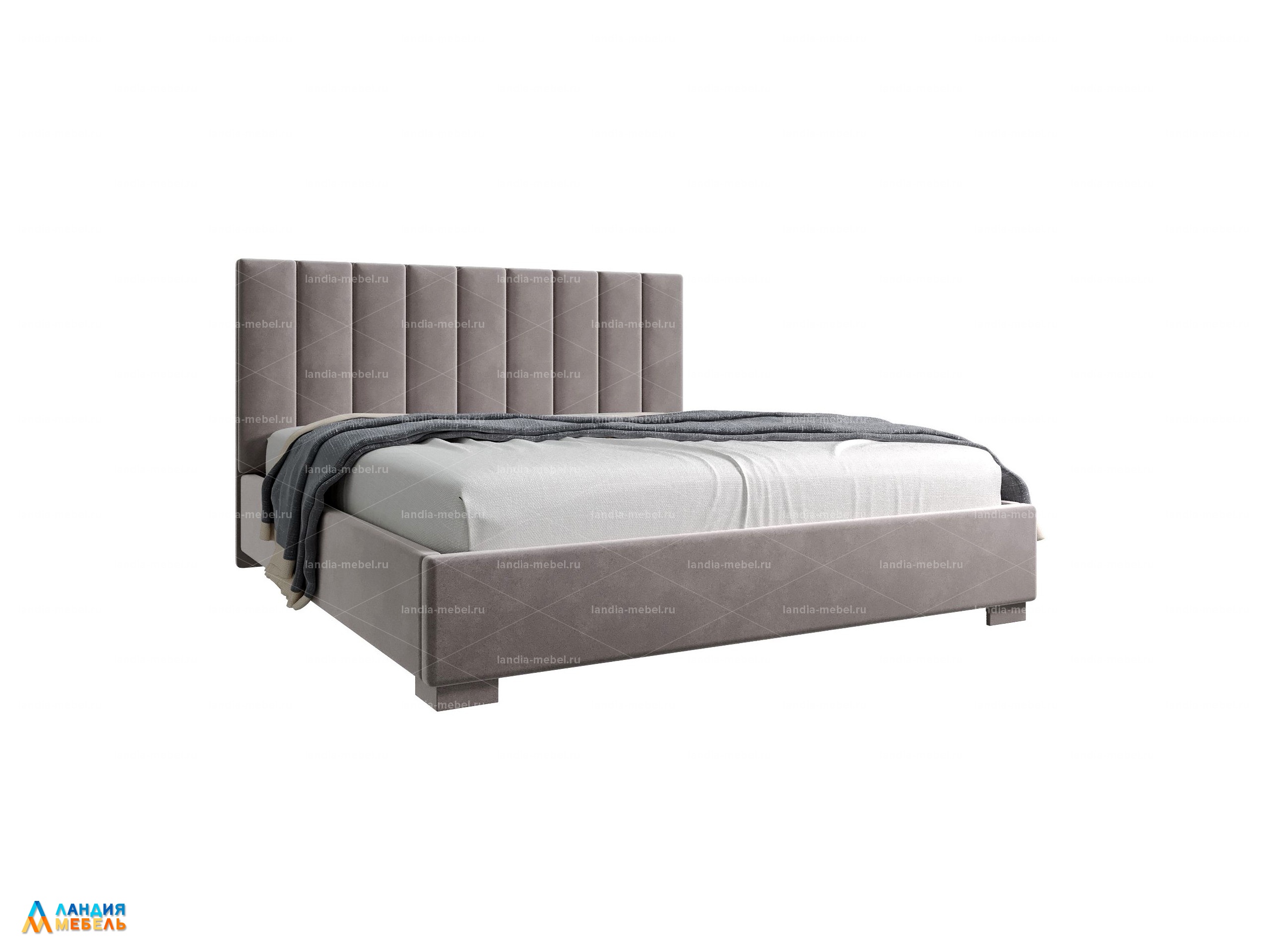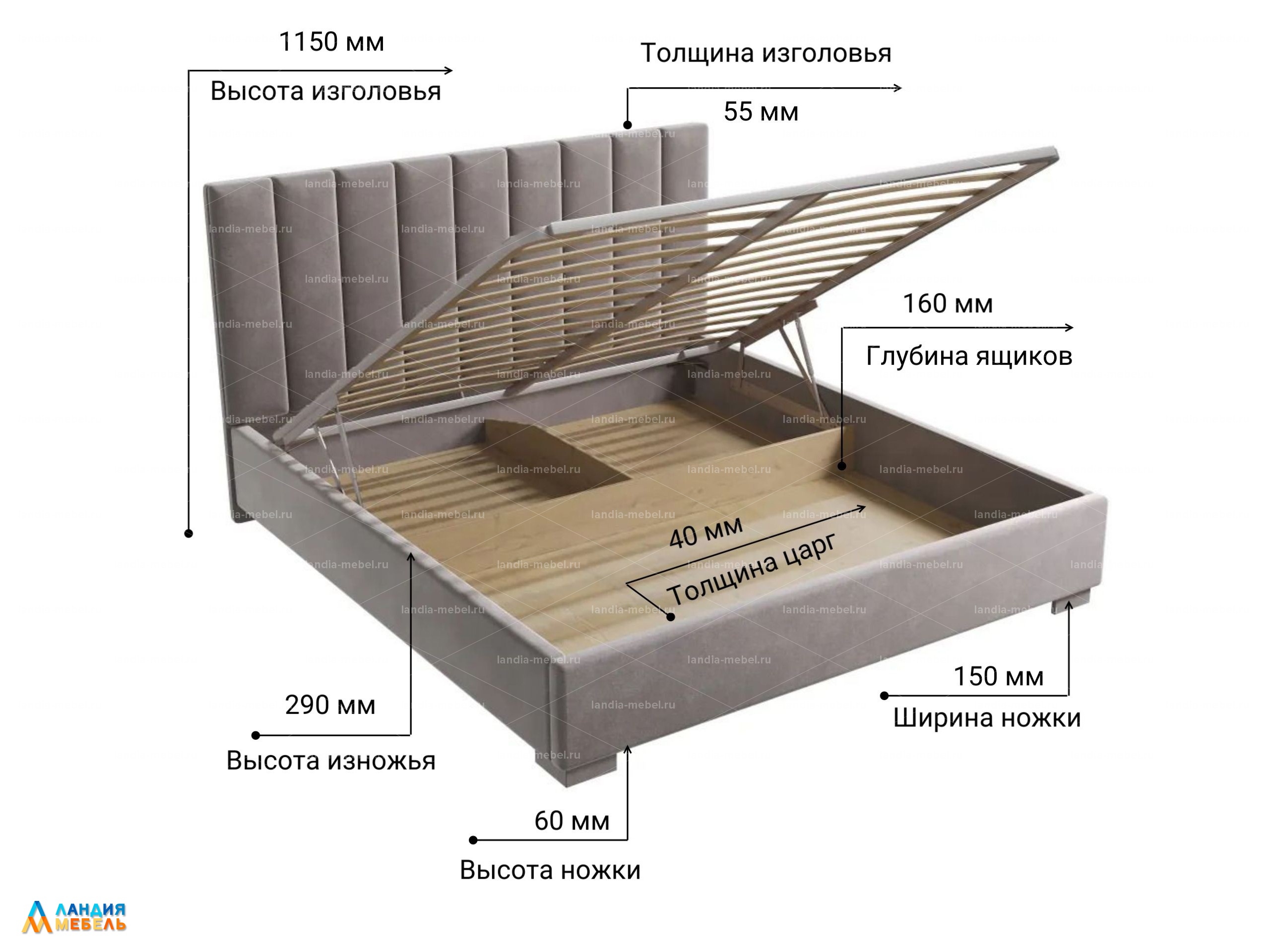 Каркас кровати полностью обтянут тканью. Размер спального места 2000х1800. В комплекте ортопедический каркас с подъемным механизмом. Бельевой ящик с настилом из МДФ листа от ножной царги до поперечной перегородки и от перегородки до спинки. Ножки из МДФ, обтянуты тканью.